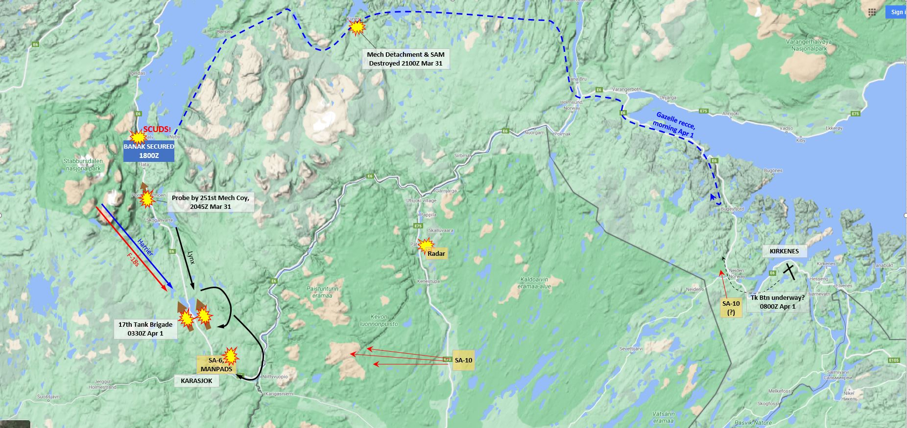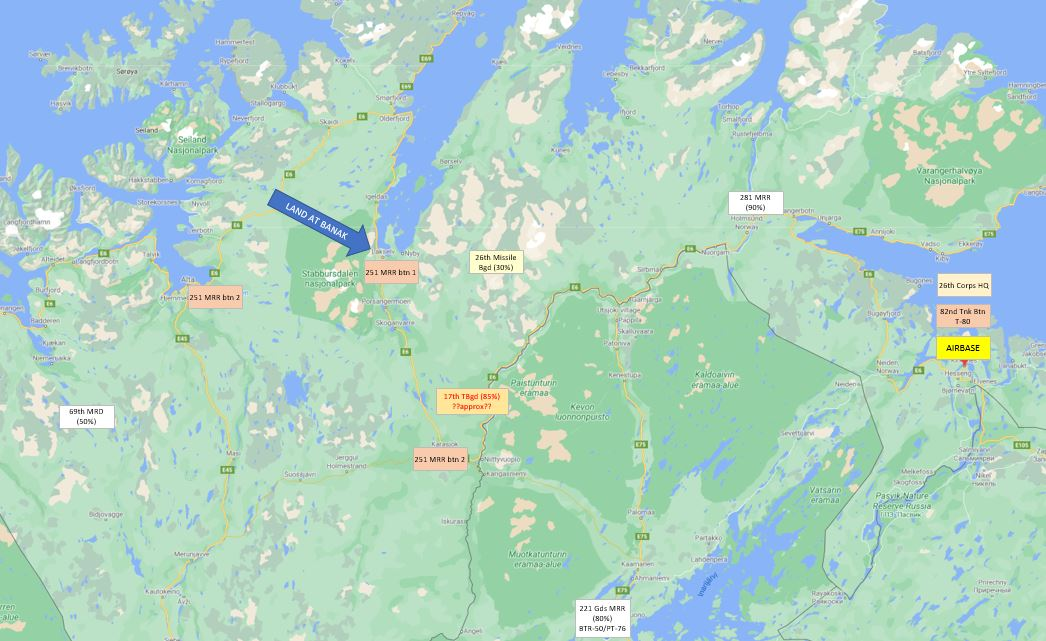 Far more worrisome is the 17th Tank Brigade, which is mostly intact, much more dangerous than a battalion of reservists, and is location unknown! "Probably NW Finland or south of Banak" say the intel guys. That means it's pretty much on our doorstep, although we're not certain exactly where. There's also one of those over-strength tank battalions (40 x T-80s, yikes), but that's far away east of us in Kirkenes, and it would probably take a full day to march here by road. It's the 17th that scares me most.