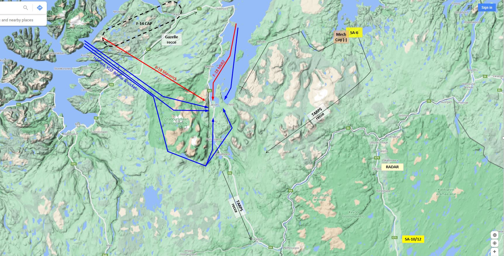 The helicopters head south along the E6 highway, staying low and hunting for enemy vehicles, but they don't find anything, at least in the first 20 miles or so. To the aircraft overhead, the situation is much different. There are multiple SAM and surveillance radars in the area, at least two SAMs radiating while moving along the road (a neat trick for SA-6s), and three more plus surveillance radars in Karasjok. The SEAD planes move in, and manage to damage and degrade the SA-6s with volleys of HARMs and Mavericks, before being chased away at low level by SA-10s fired from Finland.