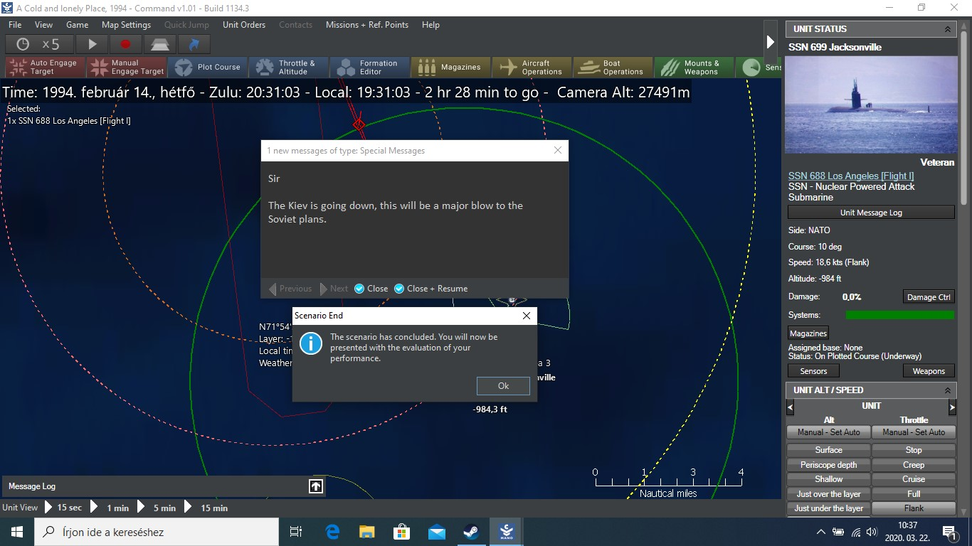 1. The USS Jacksonville set the course towards Jan Mayen island at cruise speed and max. depth (-984 ft). At every 15 minutes she stopped and came to 140 ft. The first enemy warships were detected as CZ contacts, so the submarine went beck to -984 ft and started creeping. As the enemy ships were coming closer, they could be heard even from this depth. An this was the moment when the fun started. The first victim was a brand new Krivak IV class frigate, which was sunk by two torpedoes. Right after launching, an enemy torpedo was detected, but it was far from the submarine, so the enemy did not know its exact position. It was easily dodged at flank speed (32 knots). After the chase a Kresta II class cruiser came into range. The Jacksonville fired four torpedoes to the ship (two were enough to sink it), and turned north at flank speed to avoid the next enemy torpedo. After dodging it, she slowed down to creep to avoid detection. And now the Kiev was well within range. All remaining torpedoes were launched from the tubes. Five hit the Kiev and I got the "scenario has concluded" message.